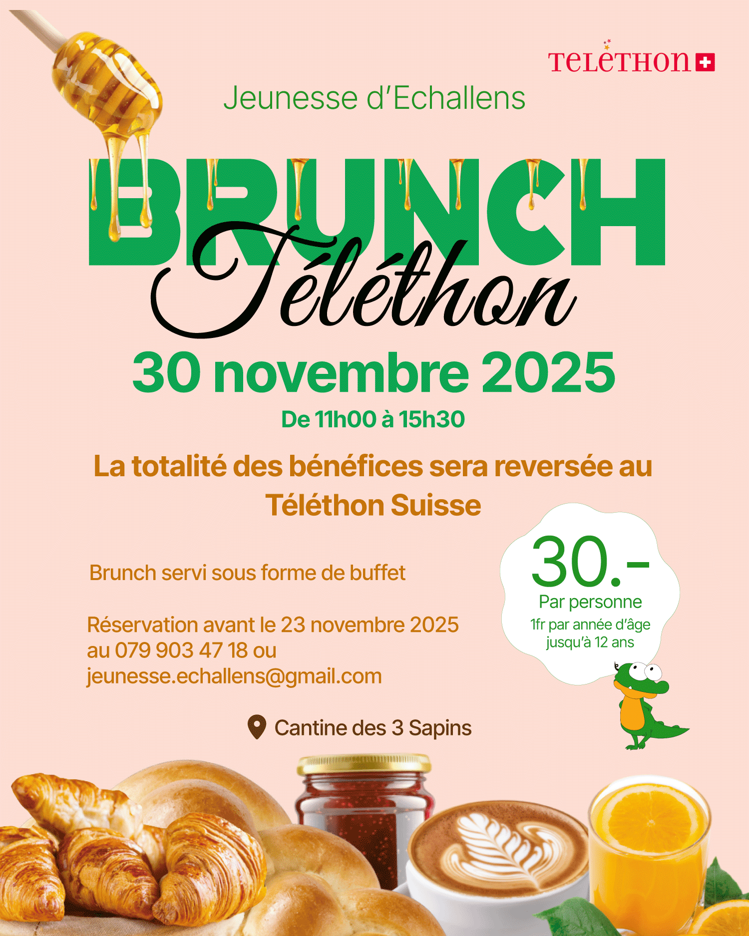 La Jeunesse d’Echallens vous invite à passer un moment convivial autour d’un brunch, entre café et croissant, pour soutenir le Telethon Suisse 🥐